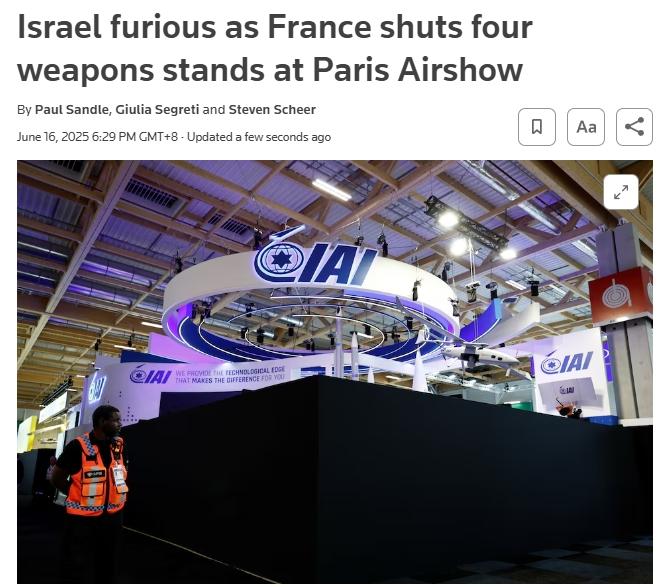 中新网6月16日电据路透社16日报道,法国关闭了巴黎航展上的四个以色列公司展位,以色列回应称:对此感到愤怒。